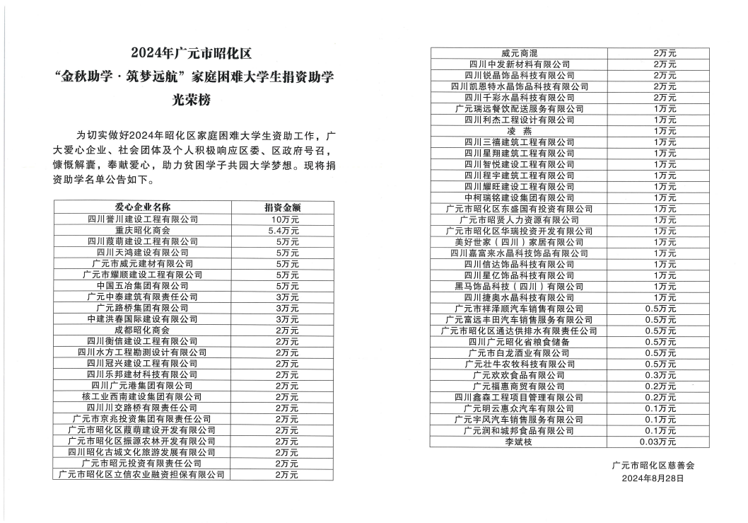 8月28日,昭化區舉行2024年“金秋助學·筑夢遠航”家庭困難大學生資助儀式,路橋集團作為資助企業參會并獲得表彰。